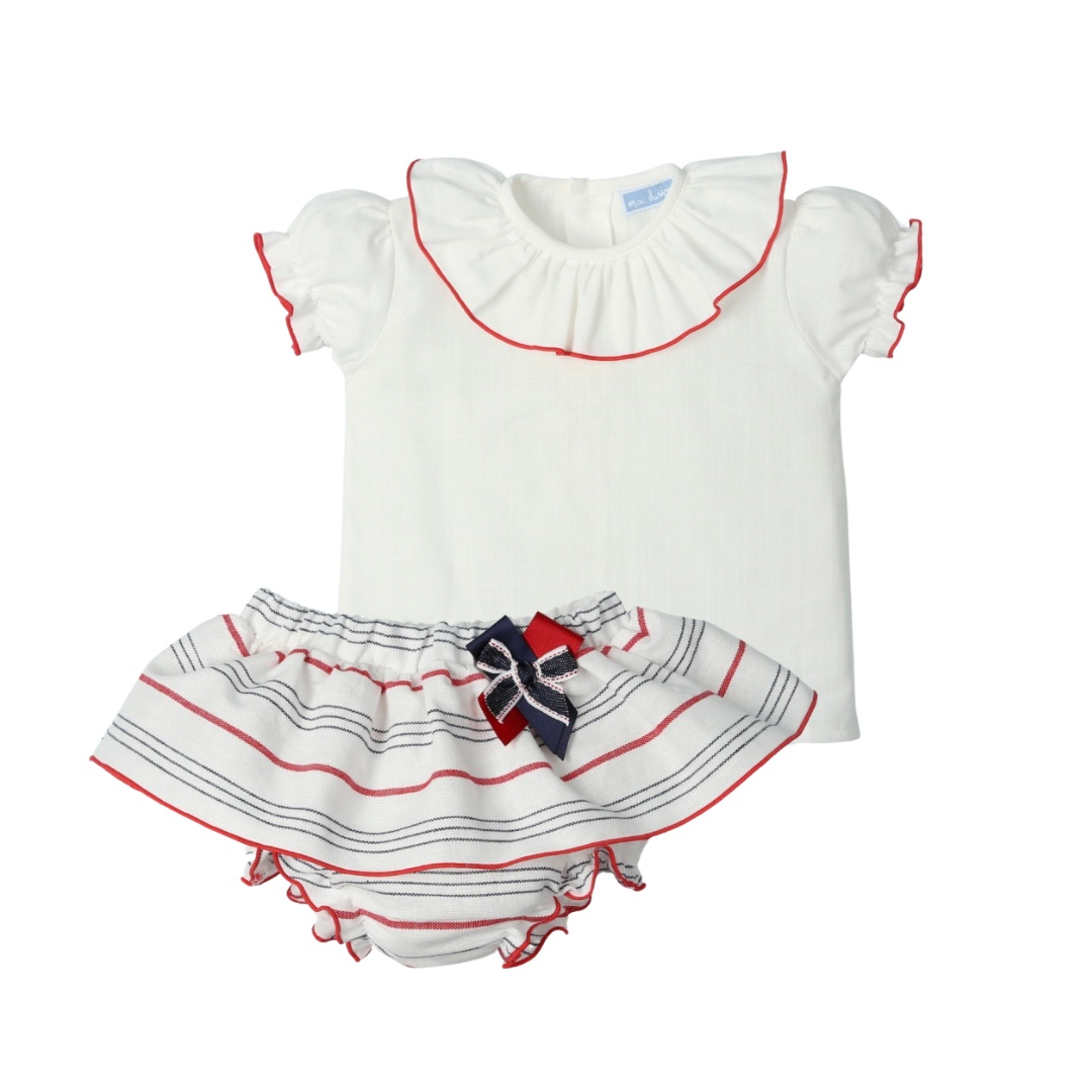 Encantador conjunto formado por una delicada blusita con volantes en el cuello y las mangas, ribeteados en rojo para un toque vibrante y elegante, perfecta para los días soleados de esta temporada. 🌞🌺