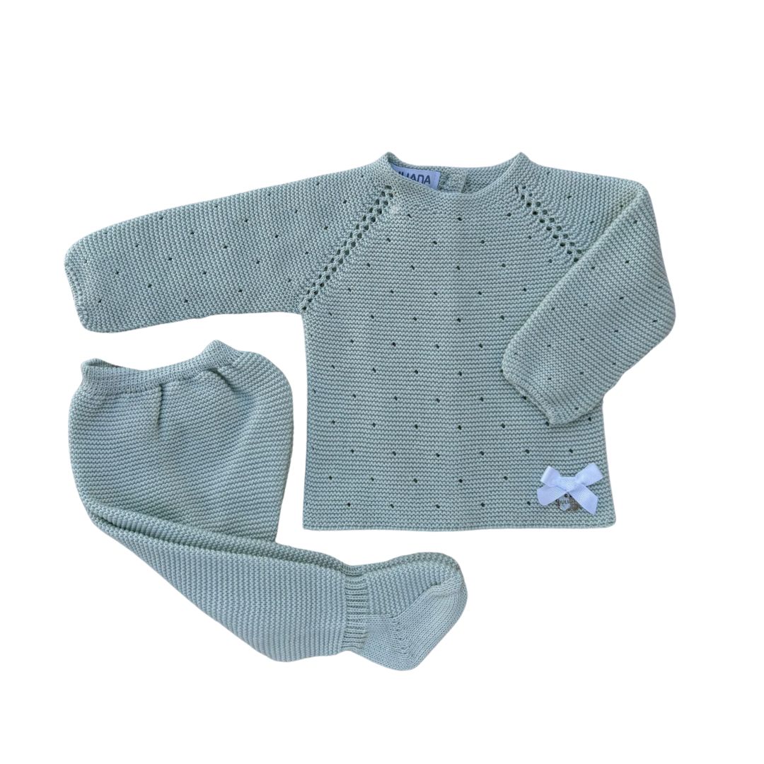 Delicado conjunto de dos piezas formado por canesú y polaina, confeccionados en un suave y fino tejido de punto en un elegante tono verde mar. 🌊✨