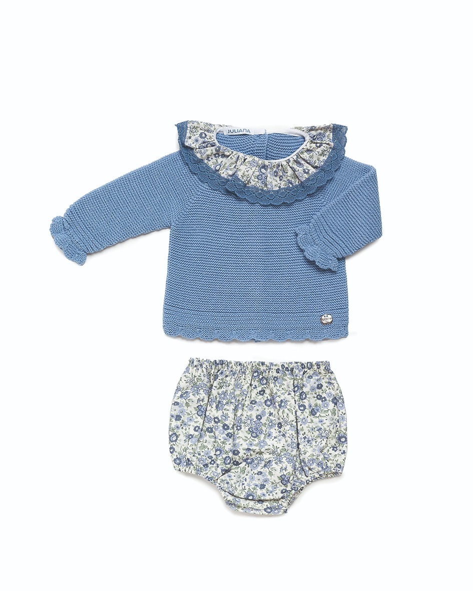 Este adorable conjunto de jerséy de punto azul es perfecto para mantener a tu pequeño cómodo y con estilo. 💙 Su encantador volante estampado con florecitas en varios tonos de azul y verde añade un toque alegre y fresco, ideal para cualquier ocasión. 🌼