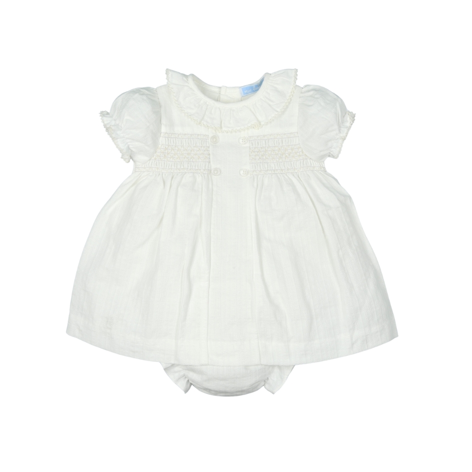 ✨ El jesusito destaca por su preciosa pechera en punto smock, finamente decorada con unos botoncitos a juego, que aportan un aire clásico y muy especial.