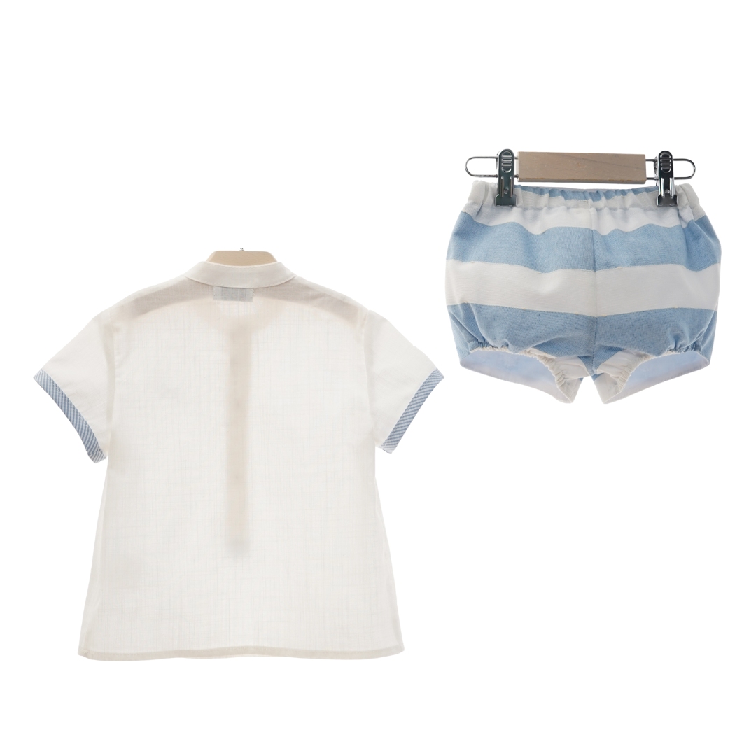 💙✨ Conjunto fresco y estiloso: camisa blanca y pantalón de rayas para los días más especiales 👦🌞
