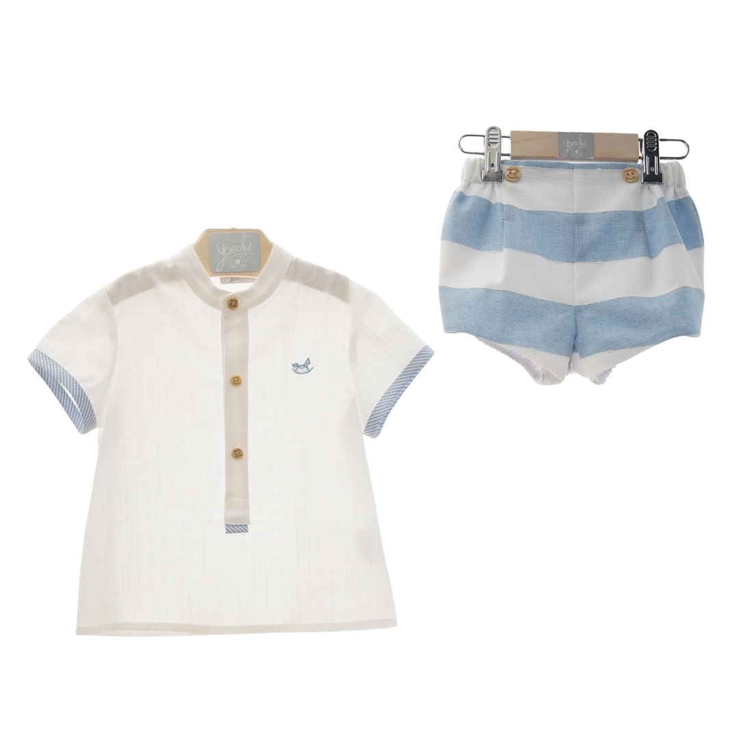 Elegante conjunto compuesto por una camisa blanca de manga corta confeccionada en suave tejido de algodón, con delicado cuello mao y vivos a contraste en los puños que le dan un toque único y sofisticado. Se abrocha por delante con botones de madera, añadiendo un aire natural y artesanal. 🌿🤍