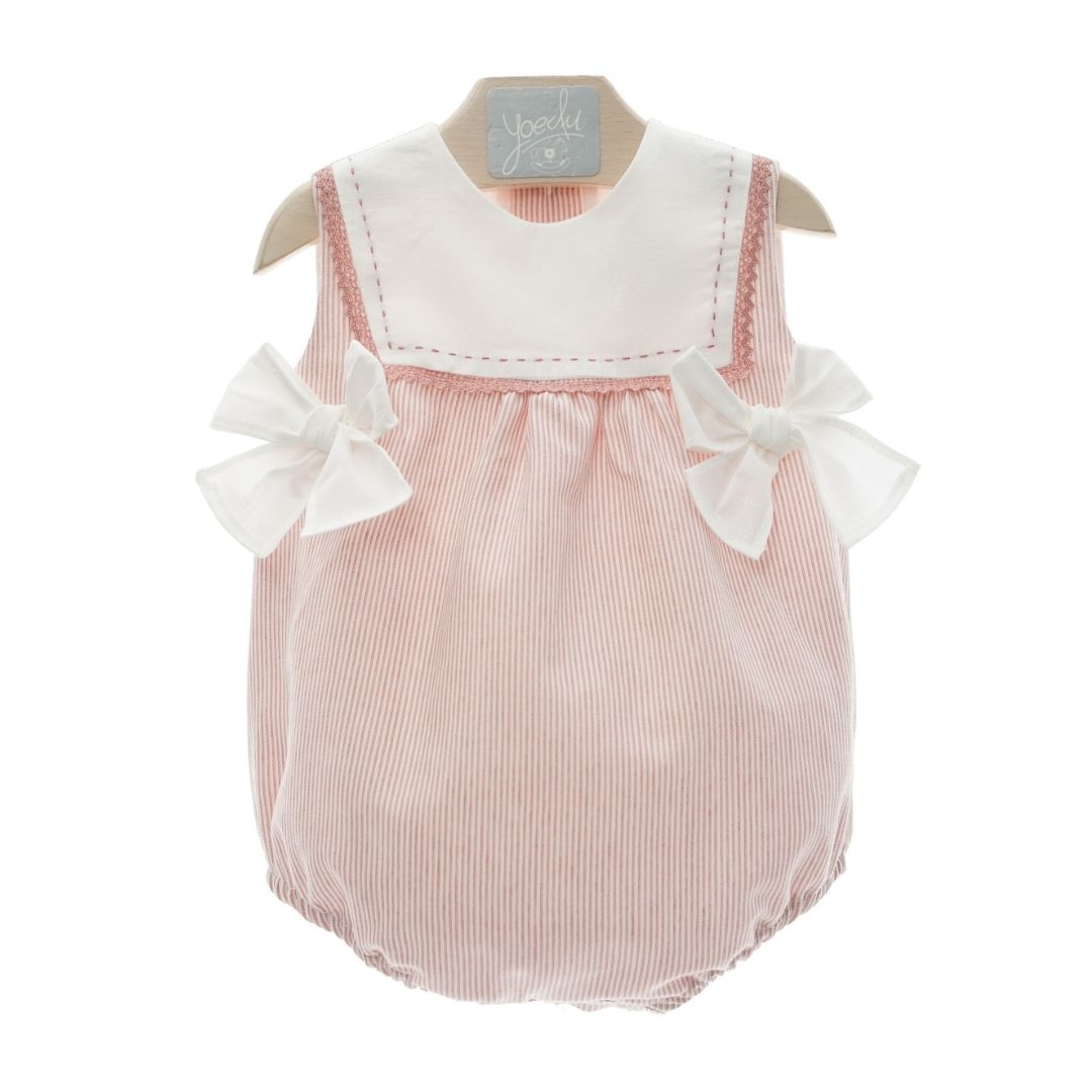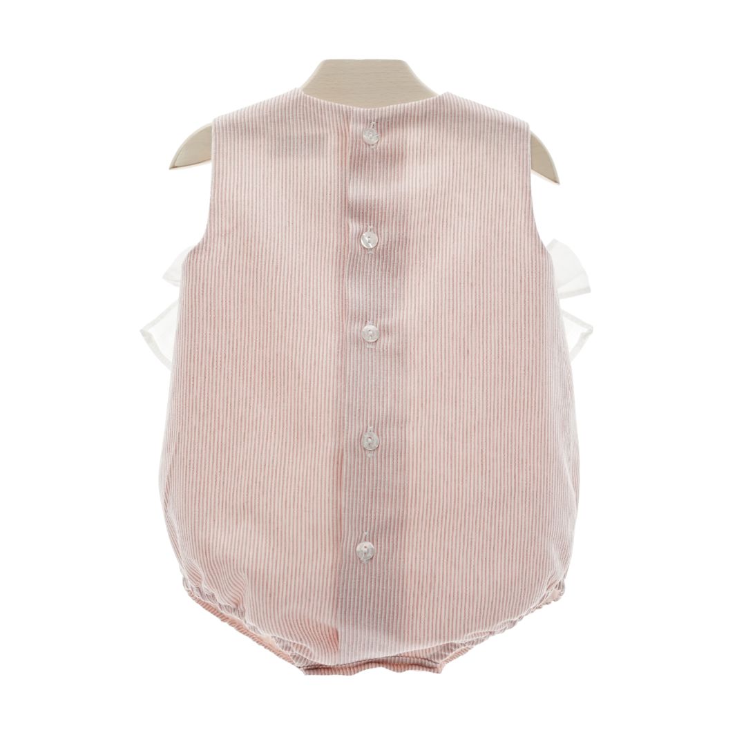 Encantador pelele bombacho confeccionado en un suave tejido de algodón con forro interior, ideal para cuidar la piel delicada del bebé. Su diseño luce un precioso estampado de rayitas verticales en blanco y rosa que aporta un aire tierno y clásico. 🍥✨